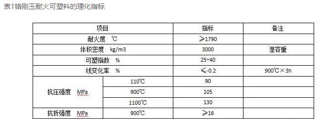 眾所周知,鉻剛玉是一種耐火原料,主要由氧化鉻和剛玉組成。鉻剛玉具有高熔點和硬度,在高溫下體積穩(wěn)定,不膨脹收縮,能很好地抵抗酸性和堿性氣體的侵蝕,不易與爐渣發(fā)生反應(yīng)。以鉻剛玉為基料生產(chǎn)的鉻剛玉耐火性高,耐磨性好,在高溫下耐酸堿侵蝕,可延緩襯里損壞,延長使用壽命。表1是鉻剛玉耐火塑料的物理化學(xué)指標(biāo)。
